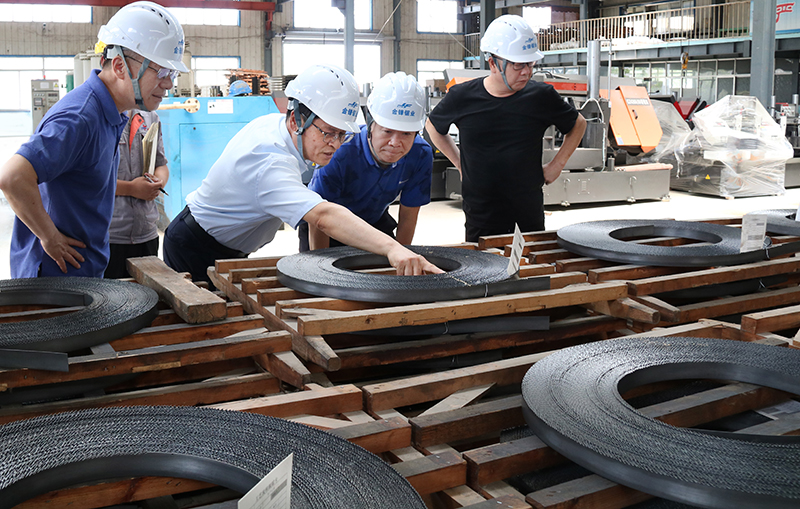 在公司第一會議室,金鋒鋸業總經理劉慶春、總工郭傳鑫和技術研發團隊向三位教授匯報了公司帶鋸床、帶鋸條研發生產情況,并詳細介紹了世界鋸切行業前沿技術與產業動態。雙方就智能高速鋸切新技術及鋸床產業升級話題展開了如火如荼的研討。教授們抓住帶鋸床帶鋸條鋸切材料性質、進給模式、負載數據傳導、齒形齒角、震動抑制等具體鋸切難題給予了詳細分析和指導。