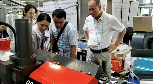 在本次展會上,金鋒鋸業展出了公司的“拳頭產品”—GS260數控帶鋸床。此設備采用PLC控制系統,可設置一組或幾組數據連續切割,精度高、切割快。彩色觸摸屏設置,新手可快速上手。此鋸床一經展出,便吸引不少中外客戶前來參觀咨詢,市場部熱情細致的講解引得連連贊嘆,紛紛表示對金鋒帶鋸床產生了濃厚的興趣。
